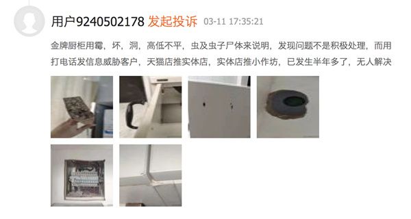 2022年3月11日,用户9240502178在黑猫平台发起投诉称金牌厨柜出现“霉、坏、洞、高低不平、虫及虫子尸体”等问题,且售后相互推诿,截至记者发稿时尚未解决。