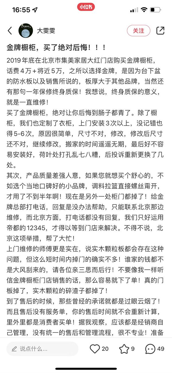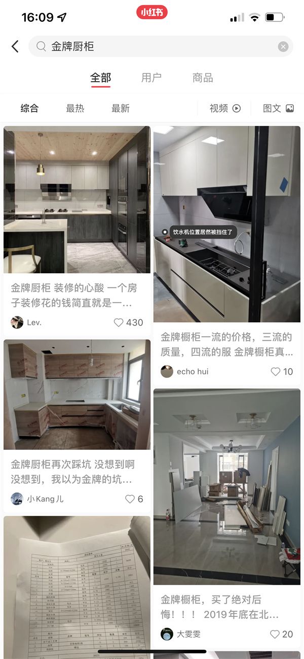 在小红书中搜索“金牌厨柜”,首屏四篇文章中有三篇为消费者投诉贴,涉及问题分别为“色差严重、安装不合理、售后拖延”、“台面厚度与约定不一致”、“尺寸不对、螺丝崩开、柜门掉落”——销售人员欺骗、安装失误及售后不作为等尚可勉强解释为个别工作人员培训不到位,但产品本身存在严重质量问题企业难辞其咎。而除了首屏的几篇文章外,在小红书中能够搜索到大量用户对于金牌厨柜质量等方面的不满,难以用正常的容错率来辩解。