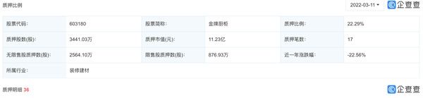据企查查显示,截至3月11日,金牌厨柜(603180)质押股数3441.03万股,质押市值11.23亿元,质押比例22.29%,质押笔数17笔。而在质押明细中,2018年至今累计共有36次质押,其中仅2020年10月后便有50%的质押原因明确为“用于补充运营及流动资金”,其余还包括用于偿还贷款等。