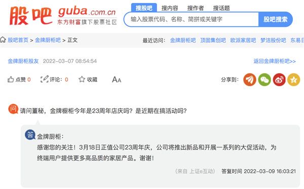 3月18日,金牌厨柜即将迎来23周年纪念日,其在投资者平台中回复股友时表示“公司将推出新品和开展一系列的大促活动,为终端用户提供更多高品质的家居产品。”