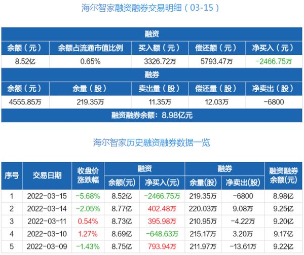 智能快讯|海尔智家:融资净偿还2466.75万元,融资余额8.52亿元(03-15)