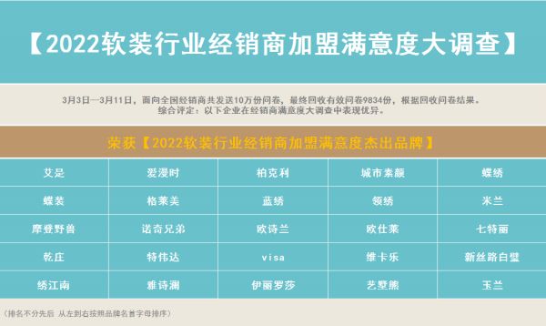 2022年3月3日至11日,中展智奥(北京)国际展览有限公司与新浪家居联合发起了【2022软装行业经销商满意度大调查】行动,主要针对目前行业内已加盟经销商展开问卷调查,旨在客观、全面地反馈真实的加盟感受。