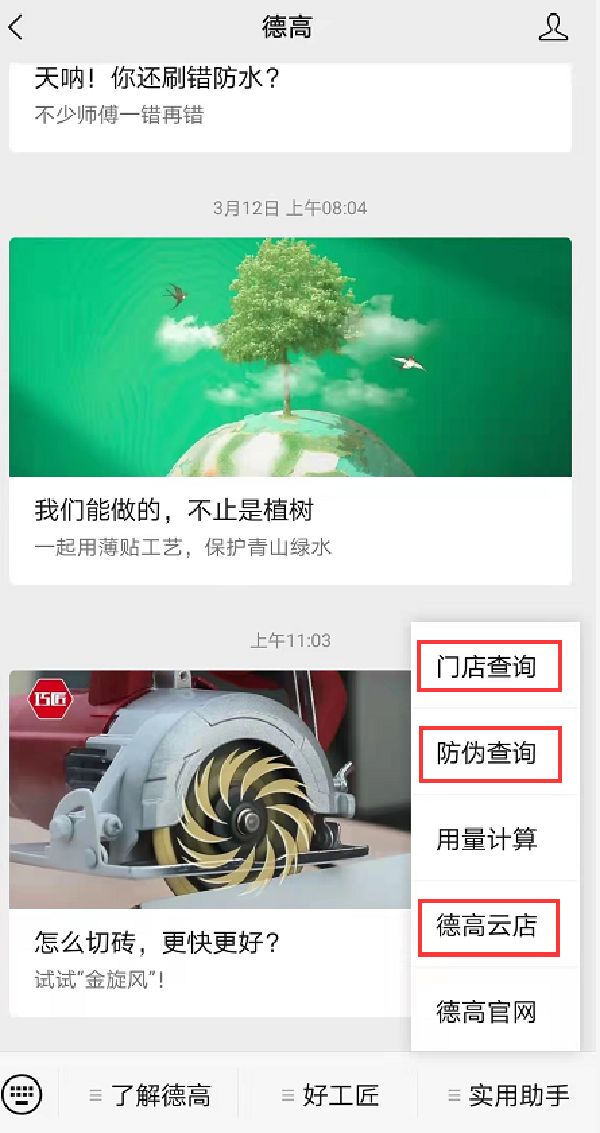 戳戳公众号右侧菜单栏-实用助手-门店查询/德高云店