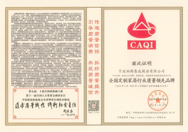 产品的质量不仅由生产者决定,更应该由顾客判定。一年一度的“315”又如期而至,柏厨家居凭借高品质产品和服务质量诚信承诺,在2022年“315”全国质量月活动中,再次获得中国质量检验协会颁发的“全国质量检验稳定合格产品”证书、“全国定制家居行业质量领先品牌”证书,为消费者吃下一颗定心丸,彰显质量安全与诚信。
