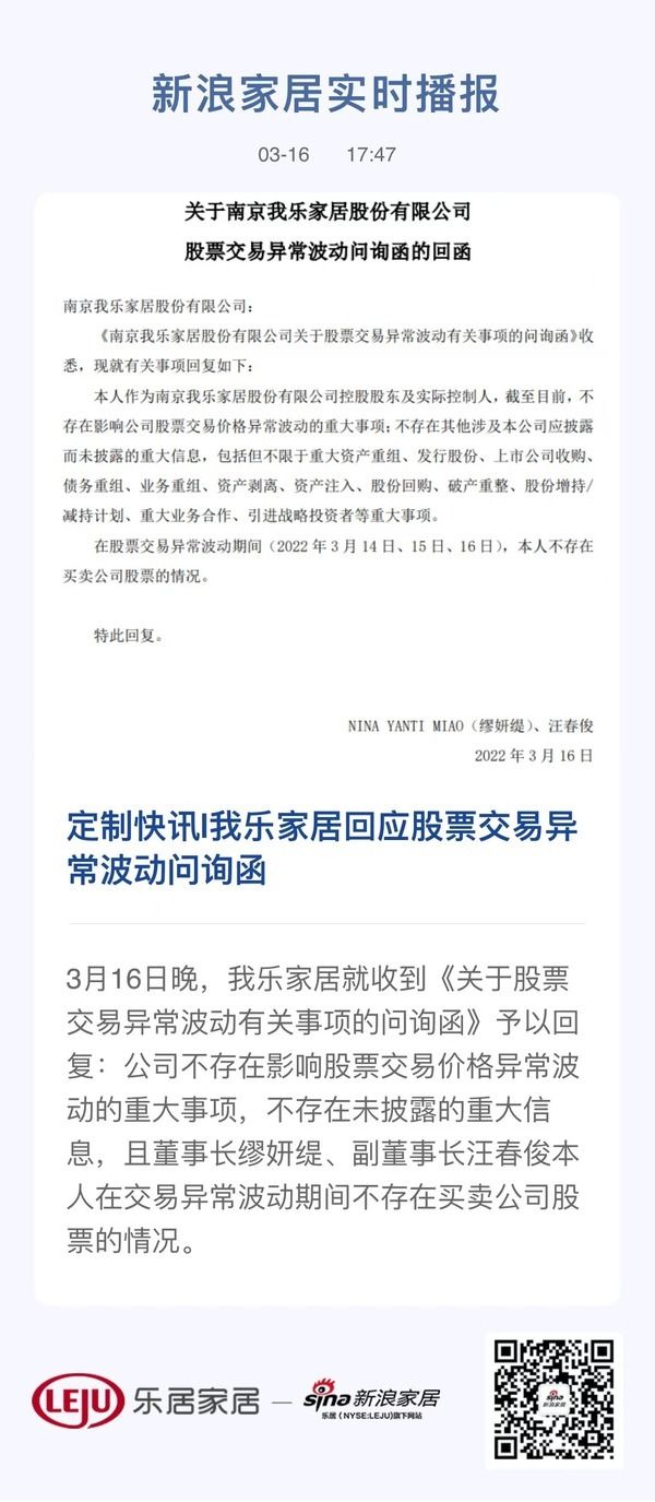 定制快讯|我乐家居回应股票交易异常波动问询函