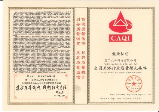 厦门大白科技有限公司荣获全国卫浴行业质量领先品牌