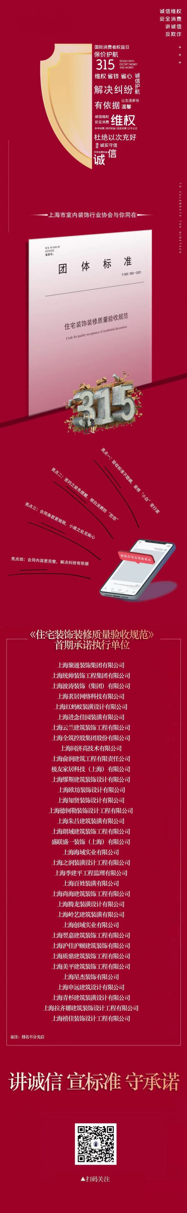 为了切实改善现状,2021年下半年,由上海消保委牵头,联合上海市室内装饰行业协会等9家住宅装饰装修企业,共同编制了《住宅装饰装修质量验收规范》团体标准。这是中国首个从消费者需求端制定的团体标准,目前已有35家上海知名装企积极响应,成为团标首期承诺执行单位。