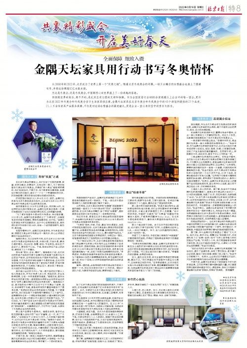 2021年4月25日,天坛家具宣布成为北京2022年冬奥会和冬残奥会官方生活家具供应商后,全司2000多人就全面进入了冬奥时刻,为43个场馆(竞赛场馆、非竞赛场馆、训练场馆)提供27个品类、21.1万件家具产品。