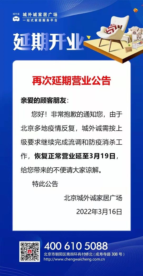 新浪家居频道讯 3月16日,城外诚家居广场发布延期开业公告:由于北京多地疫情反复,城外诚需按上级要求继续完成流调和防疫消杀工作,故而将恢复正常营业时间延长至3月19日。