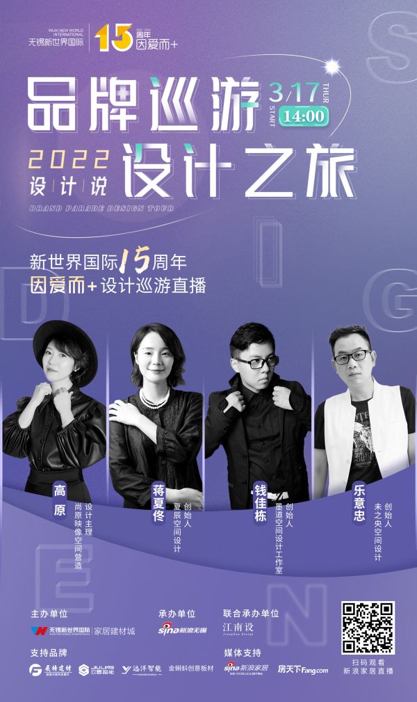 本次家居设计巡游直播由无锡新世界国际家居建材城主办,新浪无锡、江南设承办,新浪家居、房天下等媒体支持。共分为两期,时间为2022年3月17日下午2点,2022年4月20日下午2点。每期将特邀4位设计师嘉宾、4位品牌方负责人,通过直播间为为您现场讲解设计、选材方面的专业知识,带您体验最智慧的智能家居,了解最前沿的新型材料及其应用,在保持家居空间立体度、时尚度、艺术感的相融合前提下,结合智能化的影音、灯光等,打造全能、专属、定制型家居,给您带来环保、舒适、方便、智能的家居生活。