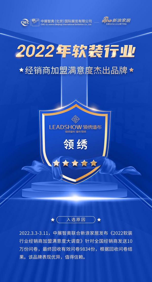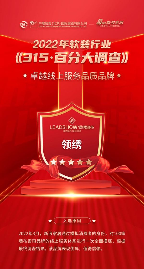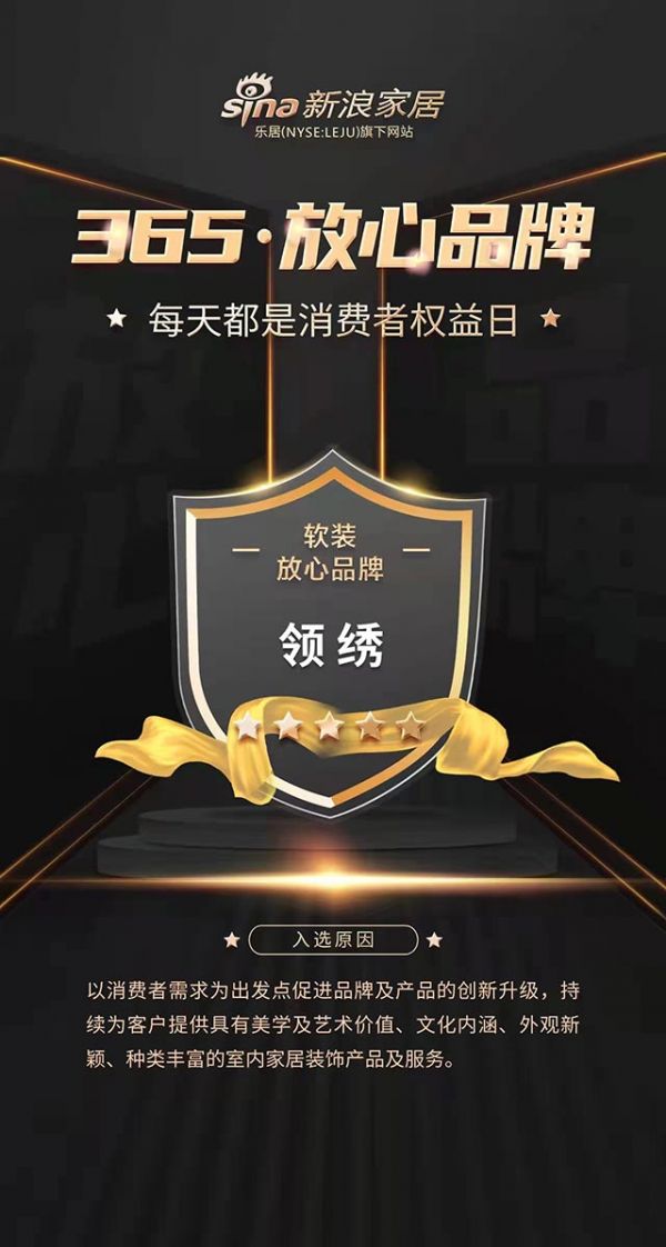3·15消费者权益日当天,领绣一连荣获“经销商加盟满意度杰出品牌”、“卓越线上服务品质品牌”“软装放心品牌”称号,三项权威认可。