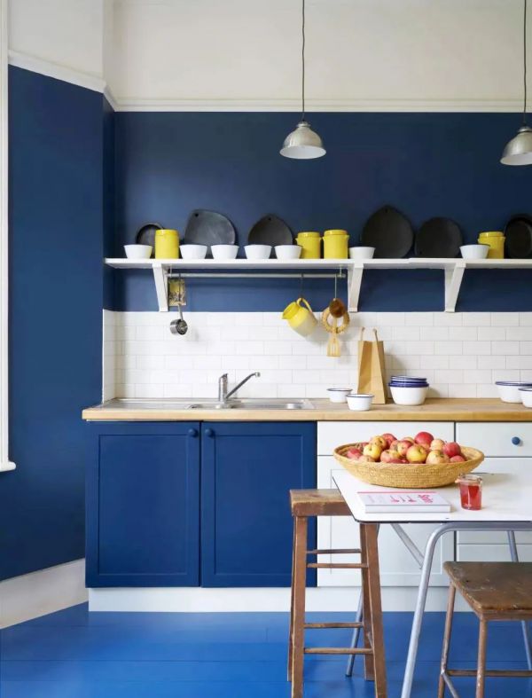 在这张图中,你会发现虽然也用了对比色(现代色彩理论中的对比色):蓝色与黄色,但由于大幅缩小了其中一个对比色——黄色的用色面积,以及大面积白色的加入,整个空间显得没有那么抓人了,更趋于平静。
