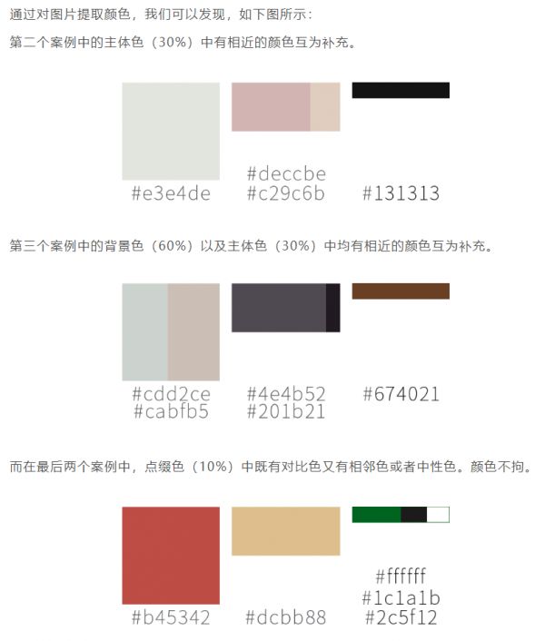 请注意,颜色遵循6-3-1原则并非意味着颜色只能有3种颜色,就像这个案例中,点缀色(10%)中用了两种:黑色与朱红。