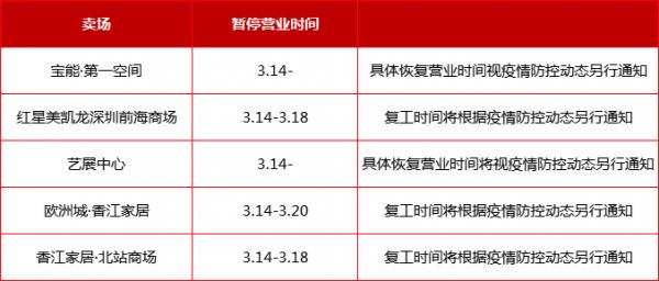 根据深圳市及区新型冠状病毒肺炎疫情防控指挥部相关政策要求,深圳多家家居卖场,如宝能·第一空间、艺展中心、欧洲城·香江家居、红星美凯龙深圳前海商场、香江家居·北站商场等相继发布暂停营业通知。自2022年3月14日起暂停营业,具体恢复营业/复工时间将视疫情防控动态另行通知。