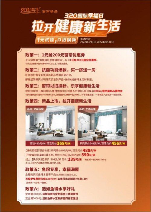 幸福与健康,是每个人的追求,也是永远紧密相连、相辅相成的,尤其这两年的疫情影响,更加凸显了健康生活对于国人追求幸福的重要性。在这样的背景下,如鱼得水窗帘以幸福与健康为源点,以国际幸福日为契机,在3月13日晚上19:30,开启一场以“320国际幸福日——拉开健康新生活”为主题的花式宠粉大战,不仅举办了全程福利的线上直播,还在线下联动了全国终端门店开展了“以旧换新”的环保公益活动,高品质抗菌窗帘成为当晚绝对C位。