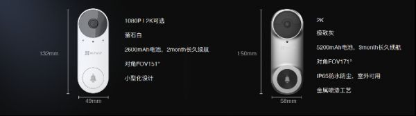 智能入户方面,萤石带来了智能门铃白色版CP3和极致灰版EP3。新一代的智能门铃创新的采用雷达技术替代PIR技术,搭配人形识别算法,可以更精准更敏锐地感知门口环境。新品外观设计更为小巧,配备2600mAh电池,并完美地继承了上一代设备的功能特性。较为特别的是,EP3支持IP65防水防尘,适用于别墅、自建房等场景使用。