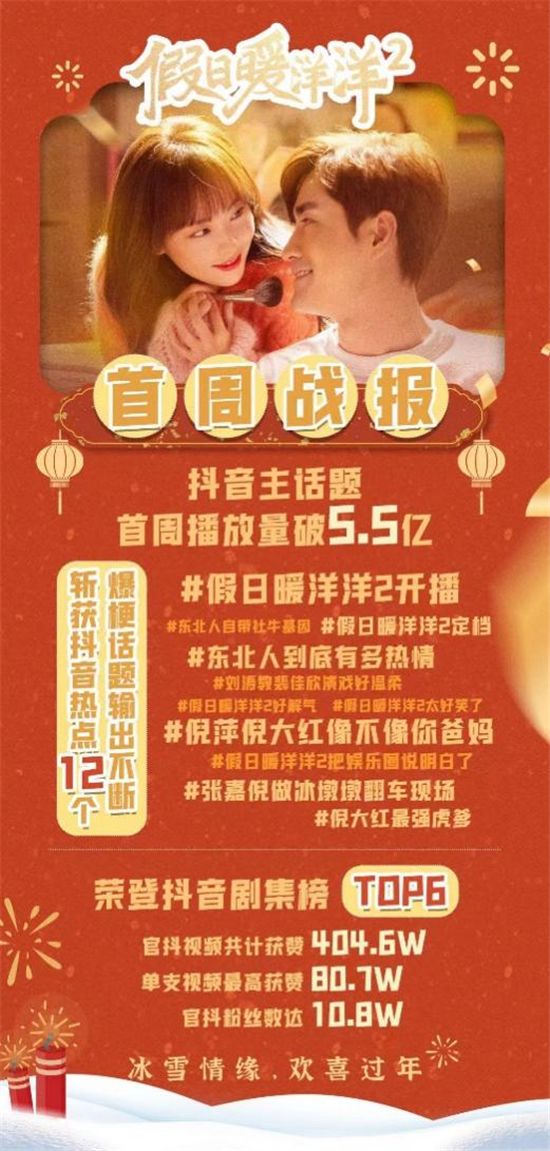 开播首周,便在抖音斩获抖音斩获#假日暖洋洋2#、#东北人到底有多热情#等12个剧集热点话题,首周播放量更是突破5.5亿+,并荣登抖音剧集榜Top6。