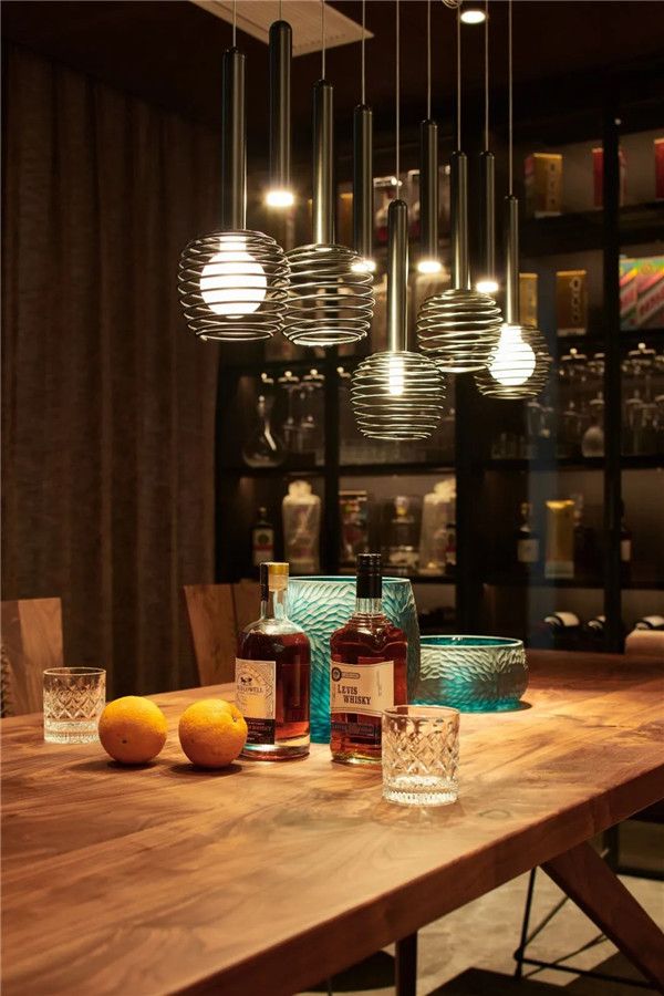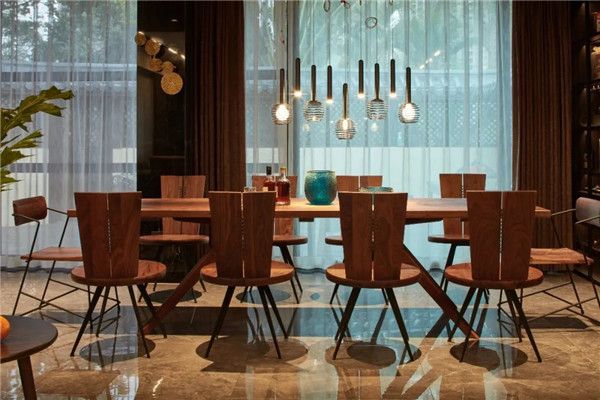 餐厅用大面积的落地窗,原木餐桌椅,精致的吊灯及装饰品,让整个空间舒适又时尚。窗外的庭院和绿植,增加了生活气息,宽大明亮的落地窗沟通了室内与室外整个空间。