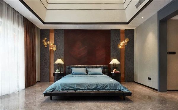 床头背景墙采用大理石、实木地板、不锈钢三种不同材料,不同颜色的碰撞,使得空间更有线条感和层次感,墙上精美壁灯是点睛之笔,视觉上显得更加灵动。白色的大穹顶,黑色装饰线条,再配以精美大气的水晶灯,让整个卧室空间更加宽敞明亮,尽显奢华气质。
