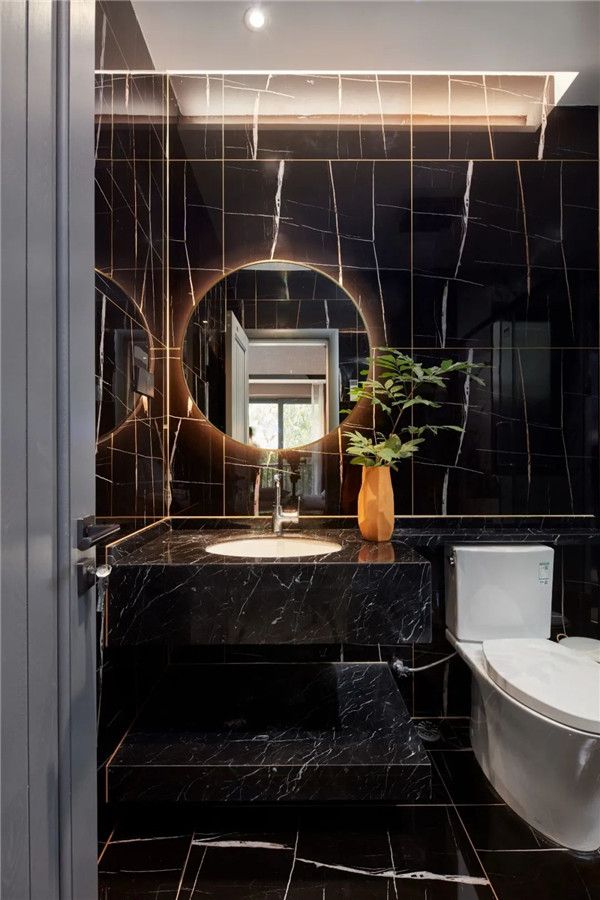卫浴间黑色和白色相呼应,橙色和绿色加以点缀,简约的型体,轻盈灵动,清透空旷区域,在沉重的空间带来呼吸感,使空间活起来。精美的妆面镜,使视觉上变得更加明亮宽敞,干湿分离的设计,实用而细腻,从细节体现出设计者对高品质生活的追求。