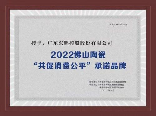 3月15日,为大力宣传绿色产品(陶瓷)认证政策,推动我市绿色产品发展,由佛山市市场监督管理局主办,佛山市禅城区陶瓷行业协会协办的“2022年佛山绿色产品(陶瓷)认证政策宣贯会及“共促消费公平”会议,东鹏控股荣获2022佛山陶瓷百家“共促消费公平”承诺品牌授牌。