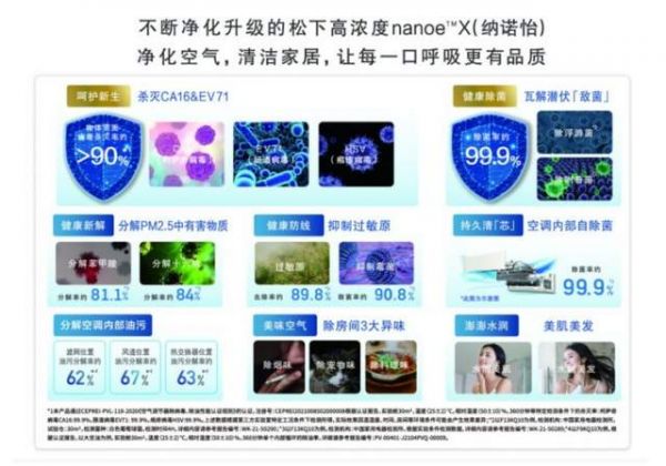 同时,纳诺怡还能分解PM2.5中的有害物质;抑制过敏源和霉菌;亲肤美发效果;对疱疹病毒、柯萨奇病毒以及肠道病毒三种病毒的物体表面病毒杀灭率达90%以上,刷新用户健康呼吸体验,赋能质感生活。