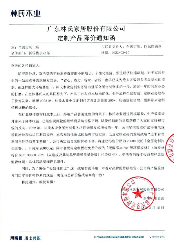 近日,林氏木业发布了《2022年定制产品降价通知函》(下称“《通知》”)。根据《通知》,在此前两轮经销商采购价格下调的基础上,林氏木业将基于自身规模效应及生产效率的提升,将降本红利全部向消费者进行释放,将建议零售价原为29800元的全屋定制拎包套餐,下调为26800元。在当前上游原材料成本上行,行业终端产品普遍涨价的大环境下,林氏木业逆势对其主打的全屋定制产品进行降价,这一举动引发了市场高度关注。