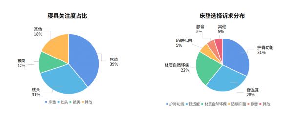 今年3.21世界睡眠日的主题是“良好睡眠·健康同行”。《2022睡眠全景白皮书》调研了1240万睡眠用户,生成了7054万份有效睡眠报告,从国人睡眠状况、差异化睡眠表现、睡眠市场观察三个方面诠释了这个的主题。随着国人对健康睡眠认知度逐渐提升,健康睡眠意愿逐渐增强,在睡眠改善过程中,人们在对寝具的选择,对床垫的关注度最为突出,占比高达39%。在床垫的选择诉求分布上,更强调其功能的具体性,如:31%的人关注床垫是否具备护脊功能,28%的人注重舒适度,22%的人更关心材质是否自然环保等。