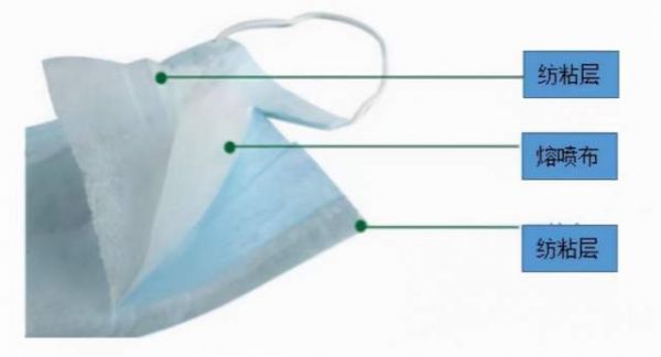 N95口罩由两层纺粘层与熔喷布构成( 参看下图),其熔喷布通常采用40克重甚至更高,再加上纺粘层的厚度,外观上看起来比平面口罩更厚一些,其防护效果至少能达到95%。