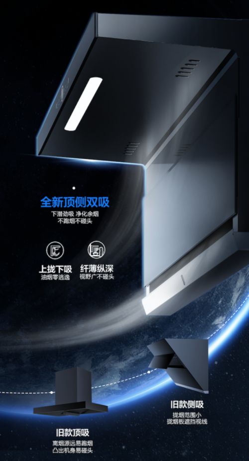 万和全新大风压潜吸油烟机L38TF结合了顶吸及侧吸的双重优点,实现24m³/min强效吸排,低位侧吸,油烟刚起就被吸走,高空顶吸,油烟过大时,轻松捕捉升腾余烟,顶侧双吸形成了一个巨大的拢烟空间,再猛的爆炒也能轻松应对,吸烟高效,油烟0偷跑。
