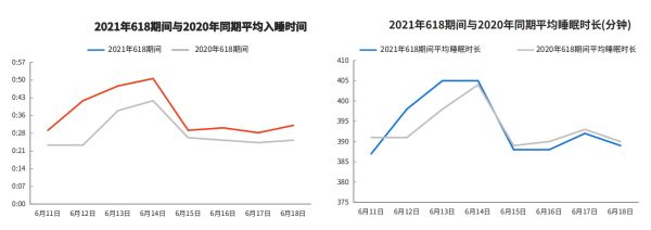 有网友特别关注一年一度的618和双11,从网络购物刺激经济发展,屡创纪录,到底有多少网民坚守在时间节点上?白皮书显示:根据往年情况,网购群体在对应时期入睡时间普遍偏晚,睡眠时长也相应缩短。但在2021年上半年,人们消费热情依然不减,平均入睡时间与2020年相比进一步推迟,睡眠时长走势却保持基本趋同。