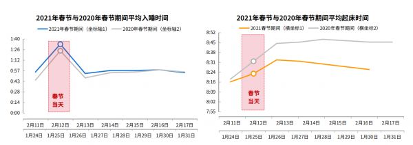 还有一组数据争议较大,就是春节期间,人们呈现晚睡晚起的特征更加明显。平时平均入睡时间在0:40之前,春节期间普遍推迟到0:40之后;平时平均起床时间处于8点之前,春节期间不需工作平均起床时间推迟到了8点之后。有网友调侃:“托疫情的福,不用早起串门,可以多睡一会儿”。