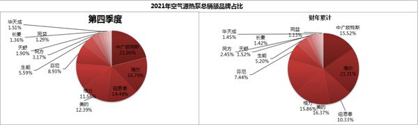 据《季度报告》显示,第四季度中广欧特斯2021空气源热泵总销额品牌市场占比高达21.06%,居行业首位,财年累计占比居行业第四,与海尔、美的、格力三大集团品牌并列,位居行业第一集团军。其中,空气源热泵采暖品牌占比数据表显示,中广欧特斯第四季度、财年累计占比均位列第一。