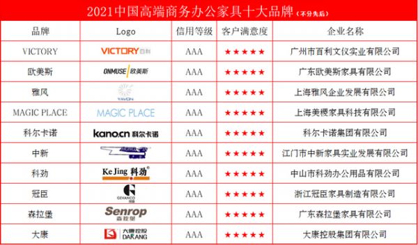在高标准、高品质、严要求、强创新的潮流驱动下,我国高端商务办公家具市场也涌现出了一批优秀品牌,这些品牌坚持工匠精神,设计出诸多铿锵有力的作品,折射理想主义与现实主义双重美学,进而引领行业向前发展。为推动我国高端商务办公家具品牌化发展,提升品牌的知名度和美誉度,招投标供应链品牌推介平台举办了“2021中国办公及商用家具评价推介”活动。此次活动,受到业内及社会各界人士的广泛关注和热情参与,参评展示家具知名品牌企业510余家,网络公众满意度市场调查投票共达829.3262万余票。各参评企业数据由机构推荐、企业自荐、大数据采集构成,并由来自质检、环保、认证、行业协会等专家对各参评品牌企业进行了综合评审,在全国办公家具行业中甄选出诚信、优质、绿色、环保、科技智能程度高、服务能力强、综合实力突出的“2021中国高端商务办公家具十大品牌”供应商,加以大力宣传,树立“中国品牌”标杆及良好形象,发挥品牌的引领作用,为各采购需求方、代理、加盟提供参考。具体如下: