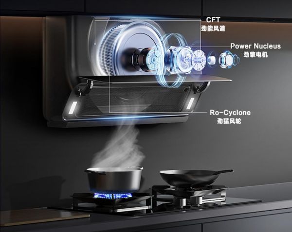 值得关注的是,老板22D2S将机身厚度压缩到18cm的同时,却还依然有着强劲的吸力表现。它搭载全新Robam Ultraslim Powertec劲薄科技核心技术,其动力系统由CFT劲能风道、Power Nucleus劲擎电机和Ro-Cyclone劲猛风轮组成。配合大算法智能驱动,三层技术合力能带来了23m³/min超大风量以及960Pa的强劲风压,远超目前市面上多数油烟机风压值,就算是30楼层的高压风阻也能轻松突破,在公共烟道的竞争中能够牢牢占据上风,强势排烟、避免倒灌。