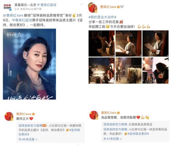 很多人可能没留意,3月9日冠珠瓷砖官博发布《坚持就会更好》品质主题片之后,惠英红立马在评论区与官博互动,惠英红所属经纪公司英皇娱乐也官宣了该影片和惠英红品质推荐官的身份。3月11日,惠英红更是将片中花絮照片与粉丝分享。