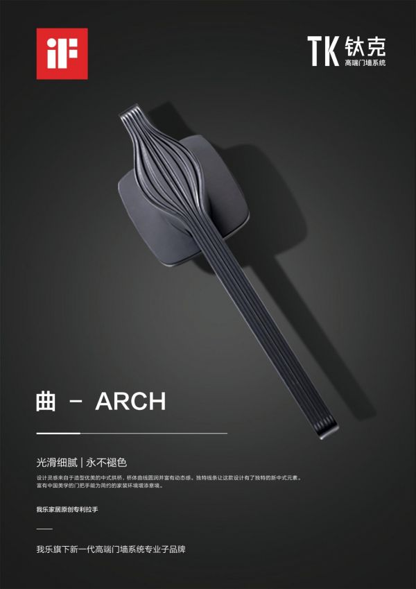 本次获得德国iF入围奖的Arch是一款新中式门把手,其设计灵感来源于造型优美的中式拱桥。中式拱桥桥体曲线圆润并富有动态感,与湖面倒影呼应,形成一个完整的弧状形态,表现出了天然的对称美。Arch将桥体曲线和这种自然的对称美感应用到造型设计上,使得整体设计集合了上下呼应的曲线对称美和线条的简约美,既有优美的形态质感,又满是细节的精致感,能表达出中国建筑的含蓄美学,为简约的家装环境增添传统文化意境。