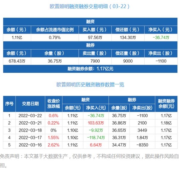 智能快讯|欧普照明:融资净偿还36.74万元,融资余额1.11亿元(03-22)