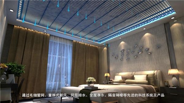 适宜的温湿度也是检验好房子的重要标准,金茂健科健康居住的另一张王牌则是毛细辐射空调系统。这套系统模仿人体毛细血管的布局,将直径细至3.35mm-4.3mm的PPR塑料毛细管组成间隔为10mm-20mm的网栅,铺贴在顶面和墙面,以水为介质,在毛细管内进行冷热辐射式能量交换,这样一来,既维持了室内温度的衡定,也让居住者免受强吹风的困扰,再配合高效保温外墙、能源热泵、24小时置换新风系统,可为业主打造温度适宜、湿度适中的舒适体感,冬天暖气的干燥、夏季梅雨季节的湿热等问题在这里都得到了解决。