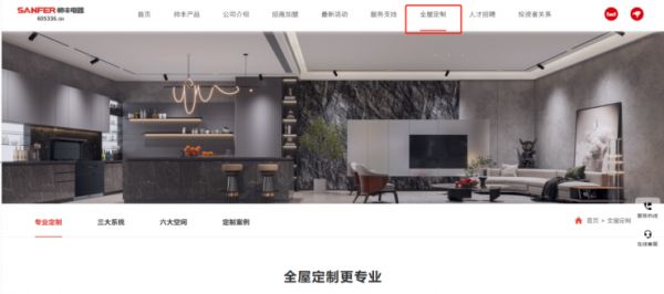 在帅丰新官网上方目录栏,帅丰产品、公司介绍、招商加盟、最新活动、服务支持、全屋定制、人才招聘、投资者关系各版块一目了然,索引规范清晰,方便用户迅速了解帅丰的深厚底蕴。
