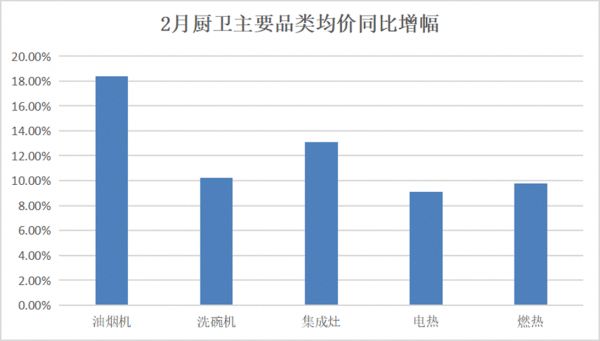 虽说没有发布明确的涨价通知,但是从外销价格来看,厨电行业各大品类还是有一定的涨幅。据奥维云网(AVC)线下市场监测数据显示,2月厨卫主要品类中,油烟机、洗碗机、集成灶、电热和燃热的均价分别为3569元、7072元、10231元、1943元和3014元,同比分别为18.4%、10.2%、13.1%、9.1%和9.8%。