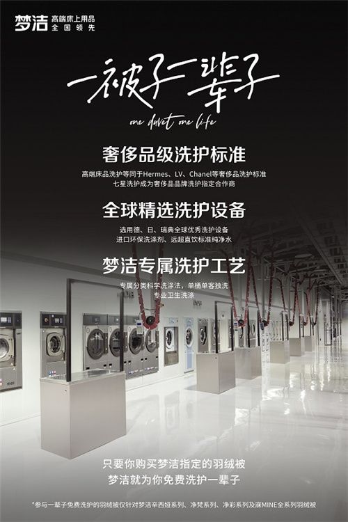 梦洁七星洗护服务,旨在满足顾客对高端床上用品的洗护及奢品的保养需求。梦洁针对高端床品,打造七星奢品洗护标准,为整洁有爱的家庭提供洗护助力。同时,七星洗护服务还采用全球顶级洗护设备,使用进口洗涤剂和远超国家直饮标准的纯净水,保证对洗护产品实现零伤害,让高端床品持续保持整洁靓丽。配合独立研发专利“分类对照洗涤法”,梦洁对不同材质、污渍实现了专业处理,轻柔洗护,能够更好呵护床品原有属性。梦洁通过七星洗护服务,为用户带来高品质床品享受,提升了用户对品牌认可度。梦洁通过高端服务升级,传递“一被子一辈子”的理念,助推梦洁高端化战略转型,坚守梦洁 “一辈子做一床被子,把一床被子做成大事业”的承诺。