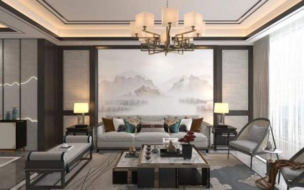 搭配中式布艺沙发、茶几、灯具