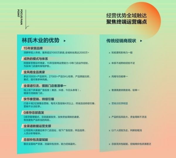 在当前流量为王的时代,流量是实现、提升销量的基础。相较于传统经销商通过在热门地段开设店铺、派发宣传单张等揽客手段,林氏木业基于互联网思维给予了经销商伙伴全渠道、全周期导流支持。