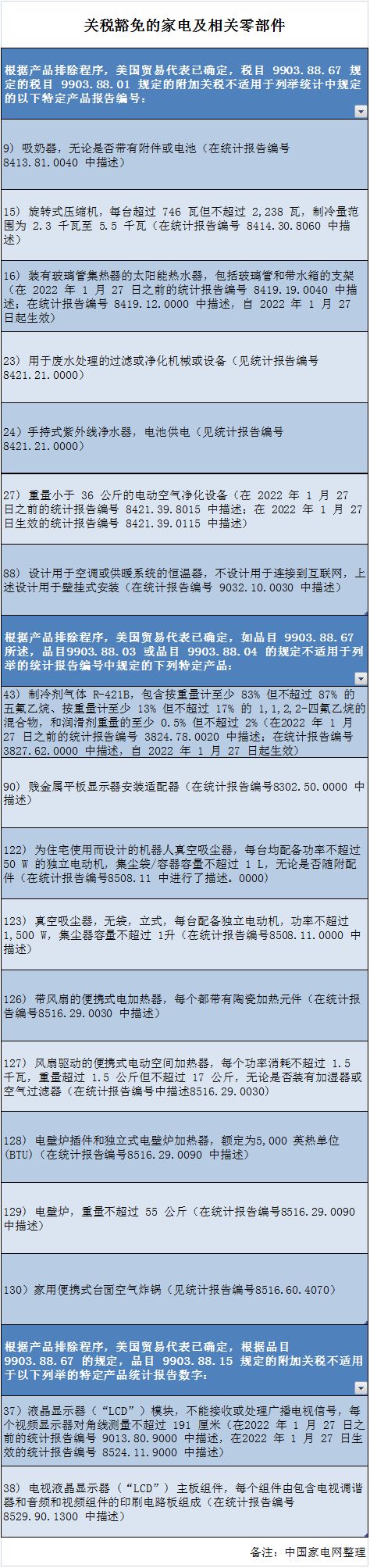 附表:关税豁免的家电及相关零部件
