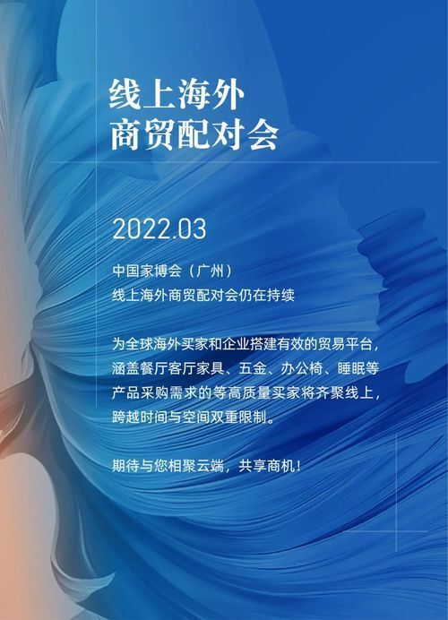 在疫情防控常态化下,中国家博会(广州)持续擦亮外销金字招牌,不仅保持了在海外的宣传推广,更进一步加强了展商观众间的对接服务,助力更高水平的对外开放。3月,中国家博会(广州)举办线上海外商贸配对会,精准邀约全球家居行业全产业链高质量买家,全方位高效对接。既满足疫情期间海外买家迫切的采购需求,又助力外销企业拓展海外新渠道,觅得新商机,获得了参与双方的一致认同与肯定。