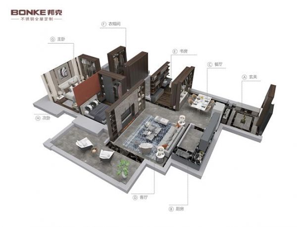 如今,邦克不止于橱柜单品,其产品线已覆盖玄关、客厅、厨卫、书房、衣帽间、阳台等全屋空间,将不锈钢全屋定制的独特优势大化发挥,为消费者带去一站式空间解决方案,打造专属化、个性化、差异化的家居空间,让一件产品一个品牌的消费方式成为过去,一个品牌满足所有,突出家居生活的整装一体化。