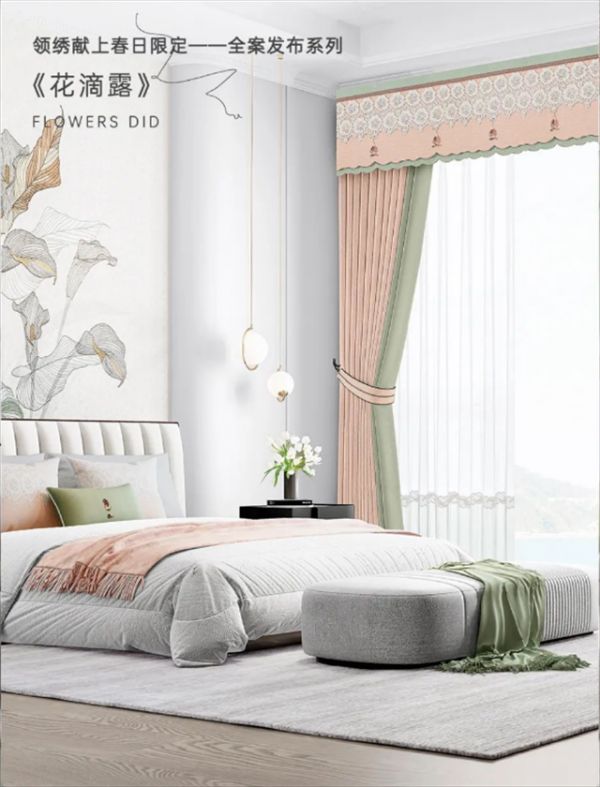 虽然在墙布领域已经久负盛名,但领绣的目光并不局限于单一品类,而是紧抓市场大势,积极推动软装一体化战略。3月中旬,领绣窗帘“恋恋不忘 才是家”最新春季新款窗帘发布会以线上大型沉浸式直播的形式震撼来袭。从自然万物到日常生活,从触手可及到心之所向,领绣全新推出的12款春季限定方案,由金牌空间设计师主笔,涵盖古今内蕴丰盈。