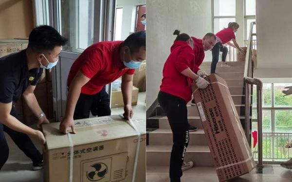 北海国美员工卸货并把空调往宿舍楼层搬货