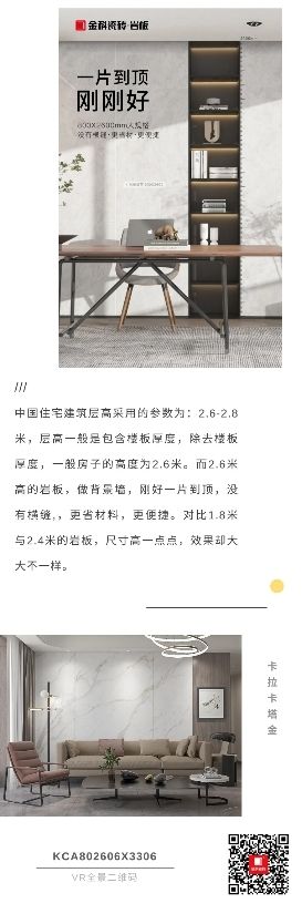 金科瓷砖800X2600mm连纹岩板,实现“一片到顶”,别样的视觉体验,C位规格,是岩板界高级范的典型产品。选择金科瓷砖,智造品质家居!